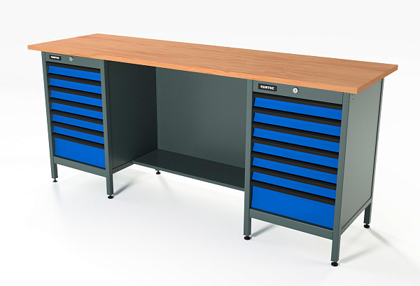 Верстак серии Standart, 2000 мм, фанера, тумба с 7-ю ящиками + тумба с 7-ю ящиками, синий RAL 5005, RUNTEC, RTS20F-TS7-TS7-5005