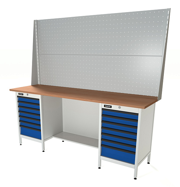 Верстак серии Standart, 2000 мм, фанера, тумба с 7-ю ящиками + тумба с 7-ю ящиками, экран 1000, синий (светло-серый) RAL, RUNTEC, RTS20F-TS7-TS7-P20-P20-5005(7035)