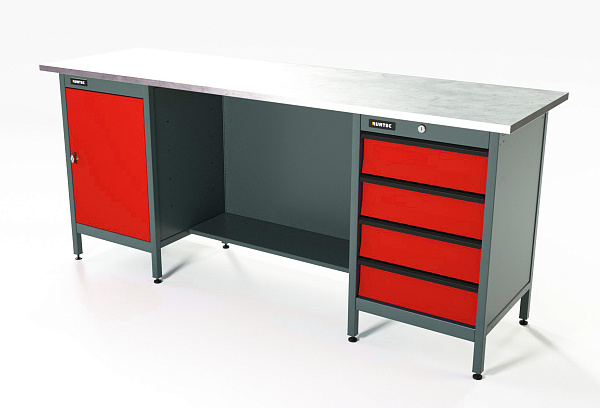 Верстак серии Standart, 2000 мм, оцинк, тумба с дверью + тумба с 4-мя ящиками, красный RAL 3020, RUNTEC, RTS20Z-TS0-TS4-3020