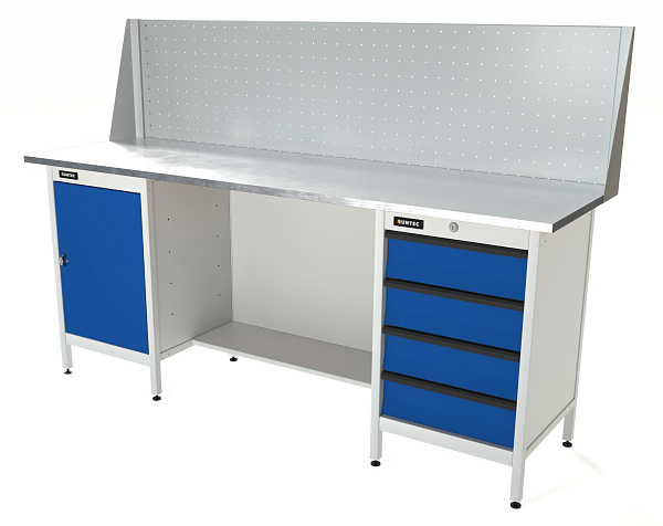 Верстак серии Standart, 2000 мм, оцинк, тумба с дверью + тумба с 4-мя ящиками, экран 500, синий (светло-серый) RAL 5005, RUNTEC, RTS20Z-TS0-TS4-P20-5005(7035)