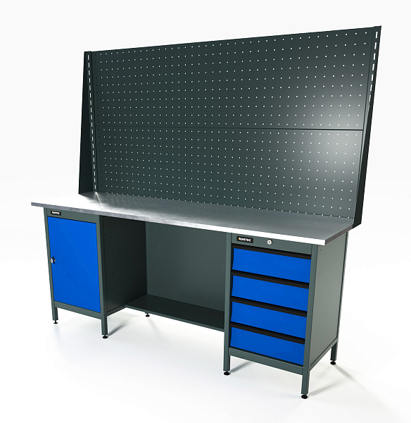 Верстак серии Standart, 2000 мм, оцинк, тумба с дверью + тумба с 4-мя ящиками, экран 1000, синий RAL 5005, RUNTEC, RTS20Z-TS0-TS4-P20-P20-5005