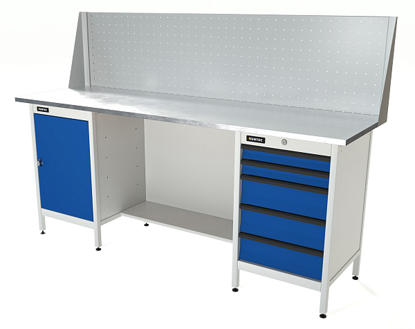 Верстак серии Standart, 2000 мм, оцинк, тумба с дверью + тумба с 5-ю ящиками, экран 500, синий (светло-серый) RAL 5005 (, RUNTEC, RTS20Z-TS0-TS5-P20-5005(7035)