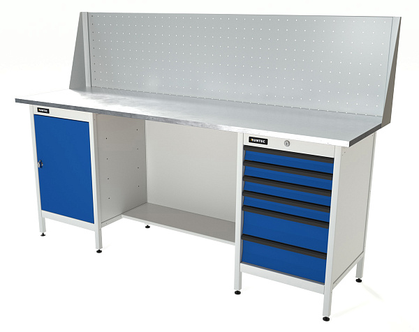 Верстак серии Standart, 2000 мм, оцинк, тумба с дверью + тумба с 6-ю ящиками, экран 500, синий (светло-серый) RAL 5005 (, RUNTEC, RTS20Z-TS0-TS6-P20-5005(7035)