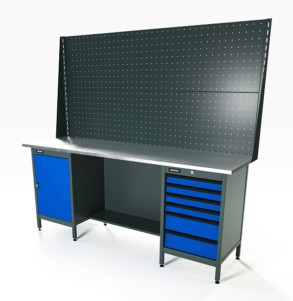 Верстак серии Standart, 2000 мм, оцинк, тумба с дверью + тумба с 6-ю ящиками, экран 1000, синий RAL 5005