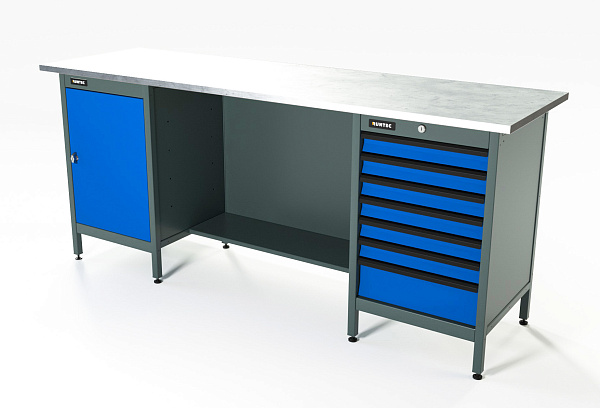 Верстак серии Standart, 2000 мм, оцинк, тумба с дверью + тумба с 7-ю ящиками, синий RAL 5005, RUNTEC, RTS20Z-TS0-TS7-5005