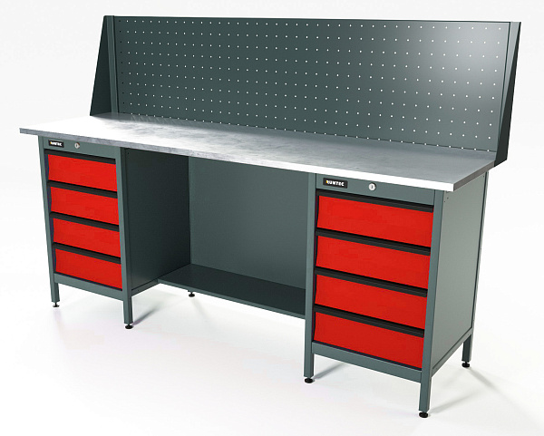 Верстак серии Standart, 2000 мм, оцинк, тумба с 4-мя ящиками + тумба с 4-мя ящиками, экран 500, красный RAL 3020, RUNTEC, RTS20Z-TS4-TS4-P20-3020