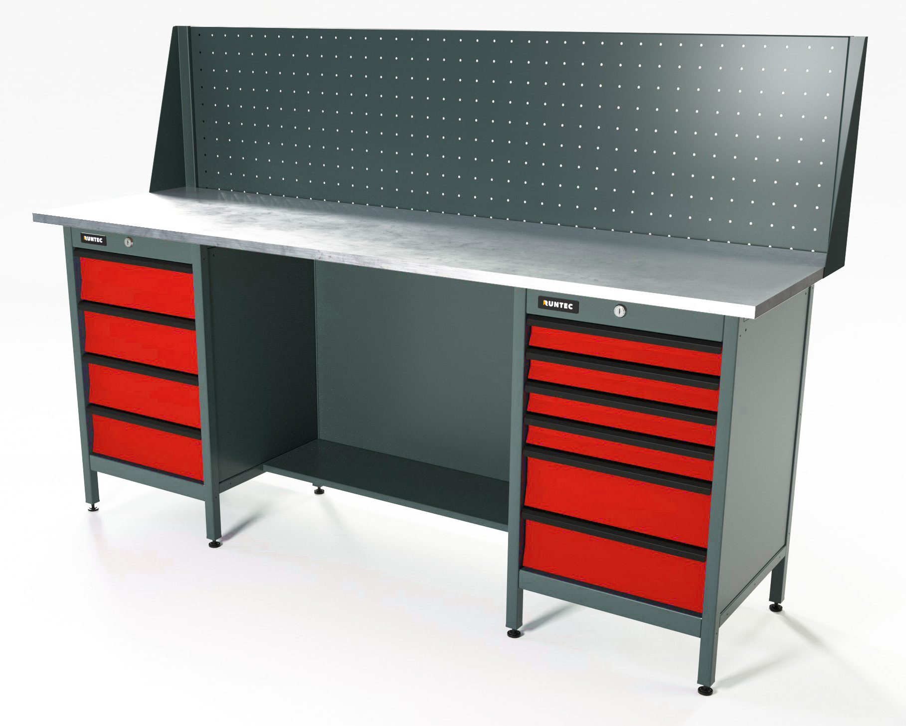 Верстак серии Standart, 2000 мм, оцинк, тумба с 4-мя ящиками + тумба с 6-ю ящиками, экран 500, красный RAL 3020