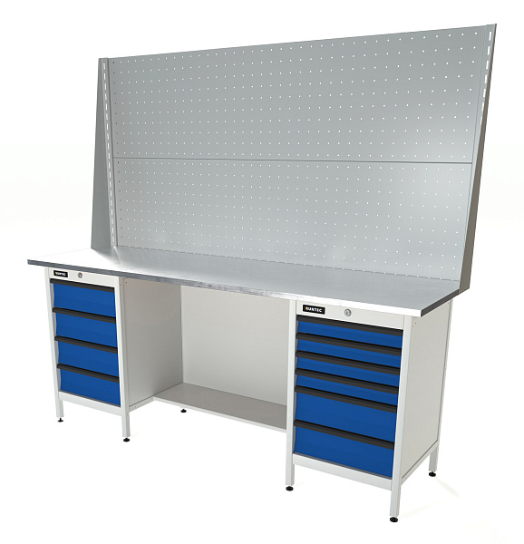 Верстак серии Standart, 2000 мм, оцинк, тумба с 4-мя ящиками + тумба с 6-ю ящиками, экран 1000, синий (светло-серый) RAL, RUNTEC, RTS20Z-TS4-TS6-P20-P20-5005(7035)