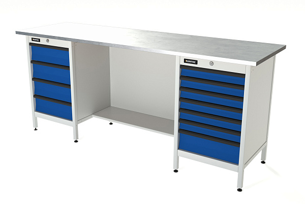 Верстак серии Standart, 2000 мм, оцинк, тумба с 4-мя ящиками + тумба с 7-ю ящиками, синий (светло-серый) RAL 5005 (7035), RUNTEC, RTS20Z-TS4-TS7-5005(7035)