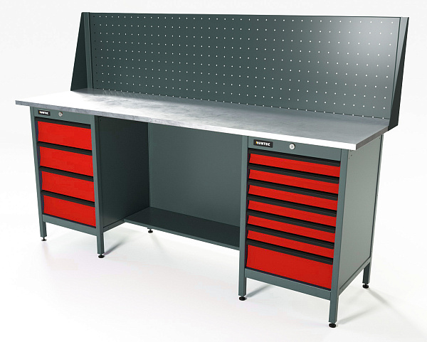 Верстак серии Standart, 2000 мм, оцинк, тумба с 4-мя ящиками + тумба с 7-ю ящиками, экран 500, красный RAL 3020