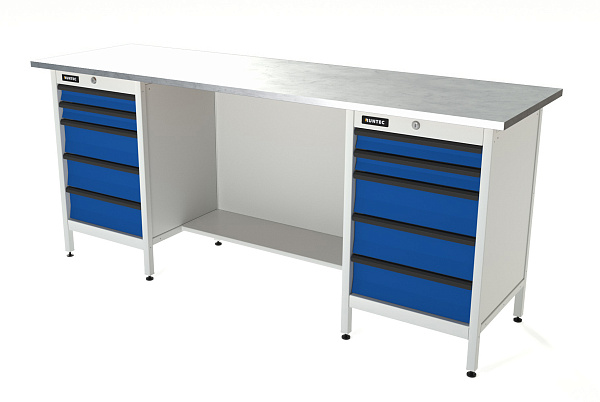 Верстак серии Standart, 2000 мм, оцинк, тумба с 5-ю ящиками + тумба с 5-ю ящиками, синий (светло-серый) RAL 5005 (7035), RUNTEC, RTS20Z-TS5-TS5-5005(7035)