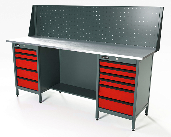 Верстак серии Standart, 2000 мм, оцинк, тумба с 5-ю ящиками + тумба с 6-ю ящиками, экран 500, красный RAL 3020
