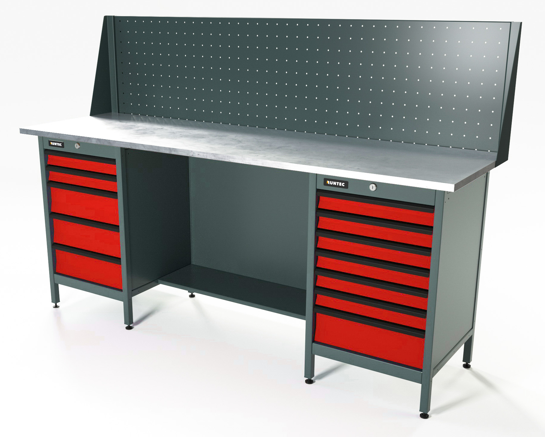Верстак серии Standart, 2000 мм, оцинк, тумба с 5-ю ящиками + тумба с 7-ю ящиками, экран 500, красный RAL 3020