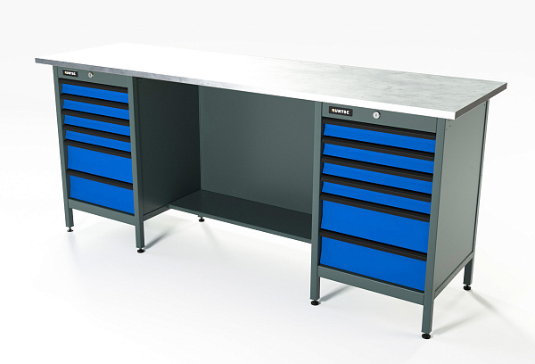 Верстак серии Standart, 2000 мм, оцинк, тумба с 6-ю ящиками + тумба с 6-ю ящиками, синий RAL 5005