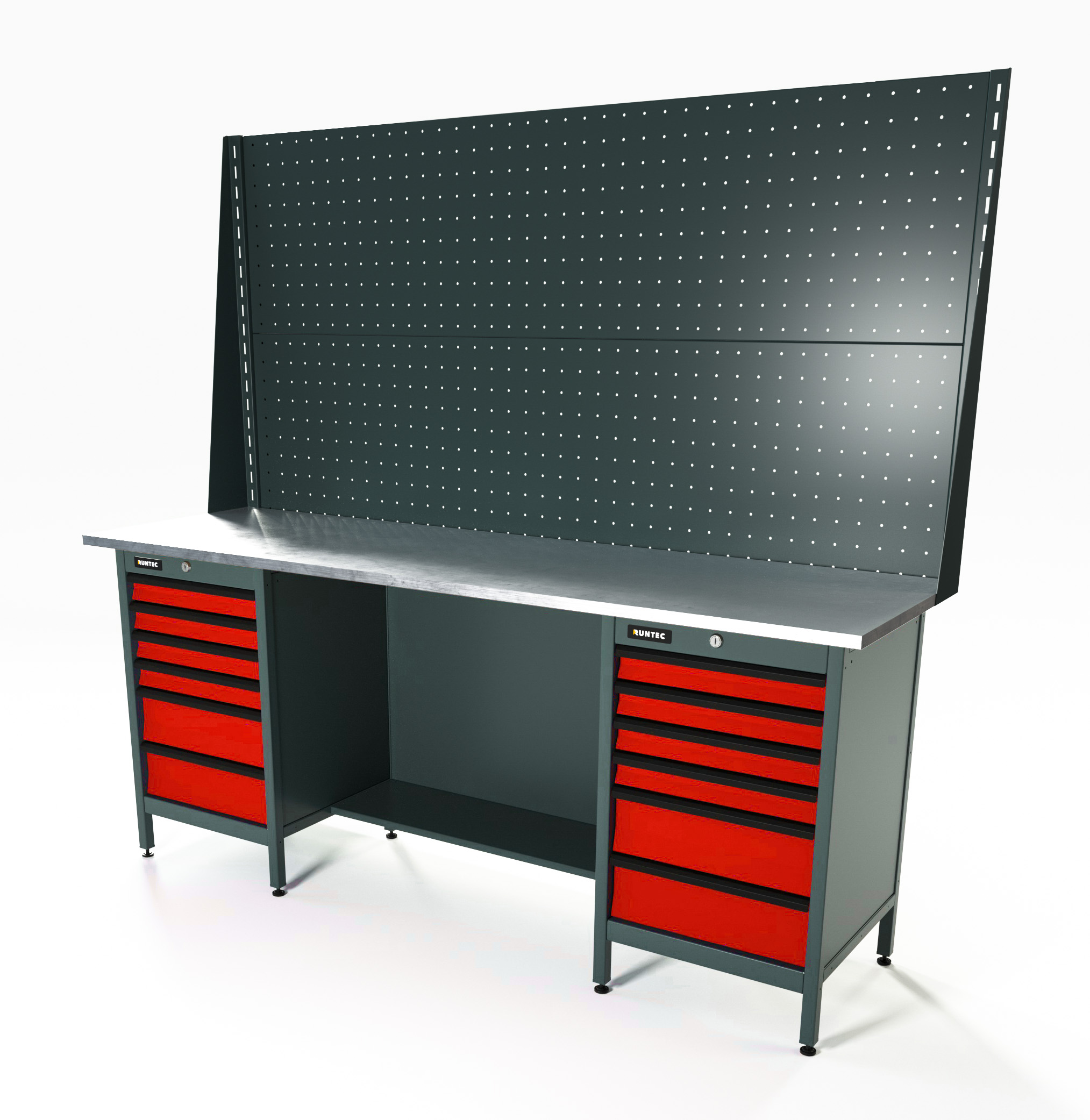 Верстак серии Standart, 2000 мм, оцинк, тумба с 6-ю ящиками + тумба с 6-ю ящиками, экран 1000, красный RAL 3020