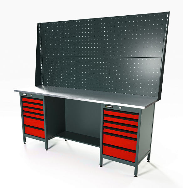 Верстак серии Standart, 2000 мм, оцинк, тумба с 6-ю ящиками + тумба с 6-ю ящиками, экран 1000, красный RAL 3020, RUNTEC, RTS20Z-TS6-TS6-P20-P20-3020