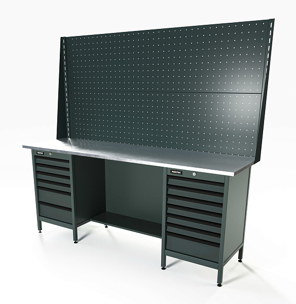 Верстак серии Standart, 2000 мм, оцинк, тумба с 6-ю ящиками + тумба с 7-ю ящиками, экран 1000, серый RAL 7016
