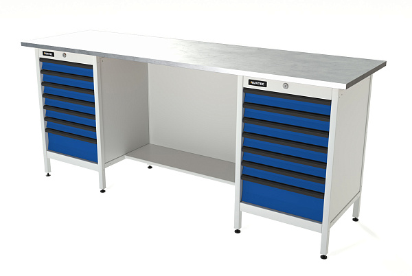 Верстак серии Standart, 2000 мм, оцинк, тумба с 7-ю ящиками + тумба с 7-ю ящиками, синий (светло-серый) RAL 5005 (7035), RUNTEC, RTS20Z-TS7-TS7-5005(7035)