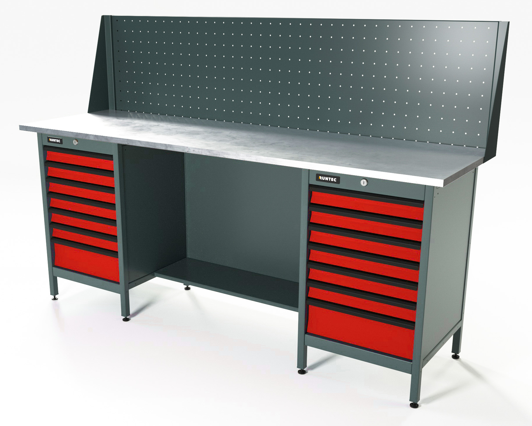 Верстак серии Standart, 2000 мм, оцинк, тумба с 7-ю ящиками + тумба с 7-ю ящиками, экран 500, красный RAL 3020