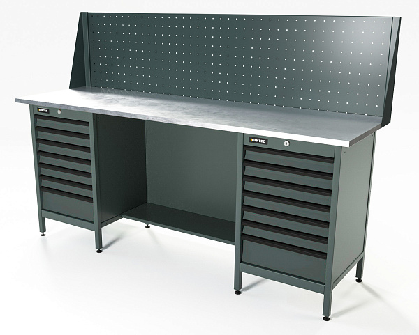 Верстак серии Standart, 2000 мм, оцинк, тумба с 7-ю ящиками + тумба с 7-ю ящиками, экран 500, серый RAL 7016