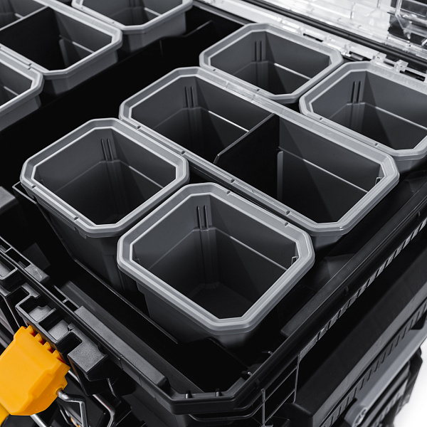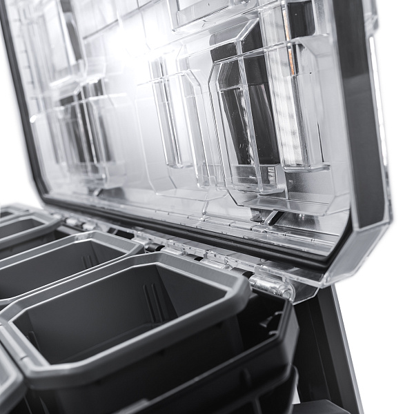 Система состоит из четырех ящиков разного размера. Верхний разделен на отделы-контейнеры, в которых удобно хранить сверла, шурупы, гвозди. Средний и нижние ящики более крупные, в них можно положить дрель, шлифмашину и другой габаритный инструмент. Ящики можно штабелировать и скреплять между собой либо использовать по отдельности.