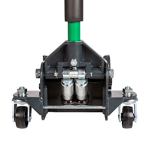 Прорезиненная рукоятка не скользит в руках, обеспечивая надежный захват. Кроме того, она поможет избежать повреждений при случайном открытии двери автомобиля. Предусмотрена ниша для хранения крепежа. Малая высота подхвата дает возможность подъема автомобилей с низким клиренсом. Поворотные колеса облегчают перевозку домкрата. Резиновый упор подъемной лапы повышает безопасность в процессе эксплуатации домкрата.