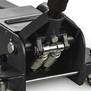 Домкрат оснащен двухпоршневым насосом — самым надёжным и современным приводом гидравлического насоса. Его конструкция позволяет быстро и легко поднять автомобиль. Усиленная конструкция базы и карданная передача усилия запорного клапана позволяют использовать домкрат с более высокой нагрузкой. Корпус выполнен с использованием высокоточной роботизированной сварки. Оснащен системой безопасного спуска, которая не позволит резко и небезопасно опустить автомобиль.
