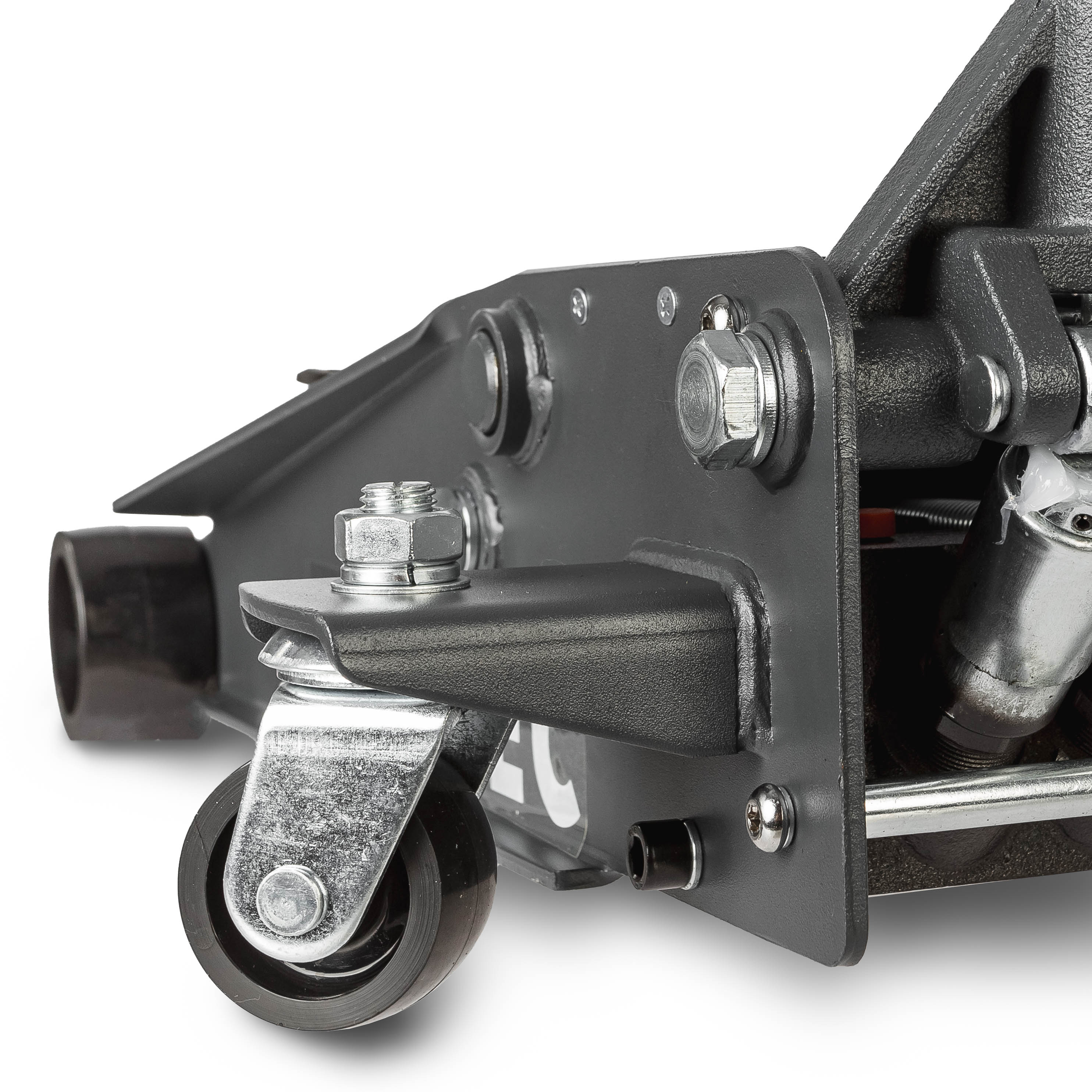 Прорезиненная рукоятка не скользит в руках, обеспечивая надежный захват. Кроме того, она поможет избежать повреждений при случайном открытии двери автомобиля. Предусмотрена ниша для хранения крепежа. Поворотные колеса облегчают перевозку домкрата. Резиновый упор подъемной лапы повышает безопасность в процессе эксплуатации домкрата.