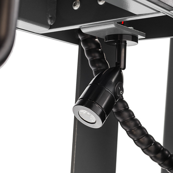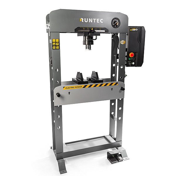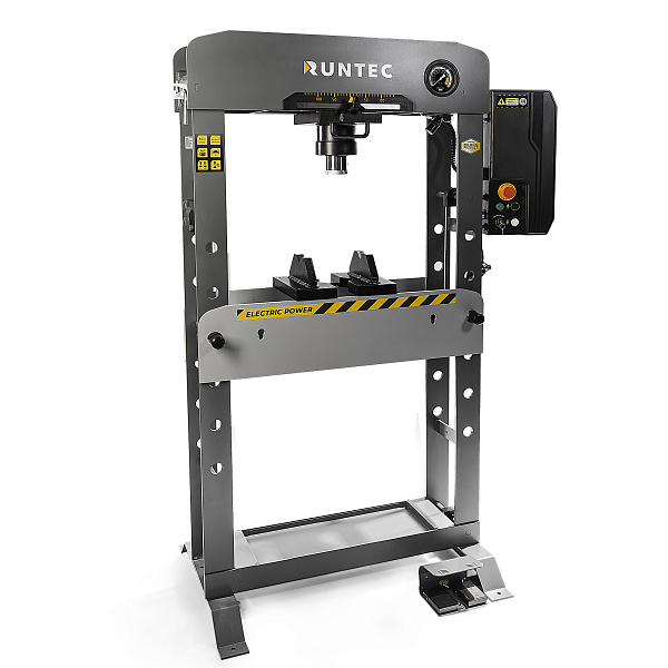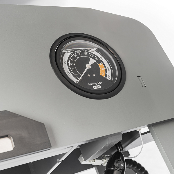 Пресс имеет подсветку рабочей зоны, что позволяет безопасно и точно выполнять операции даже при недостаточном освещении. Управление может осуществляться как вручную, так и при помощи ножной педали, что повышает удобство эксплуатации. Для защиты от несанкционированного использования предусмотрен ключ-блокировка. Давление контролируется с помощью глицеринозаполненного манометра, обеспечивающего точные показания и устойчивую работу при вибрациях.
