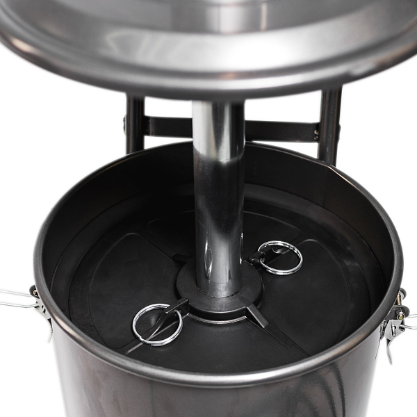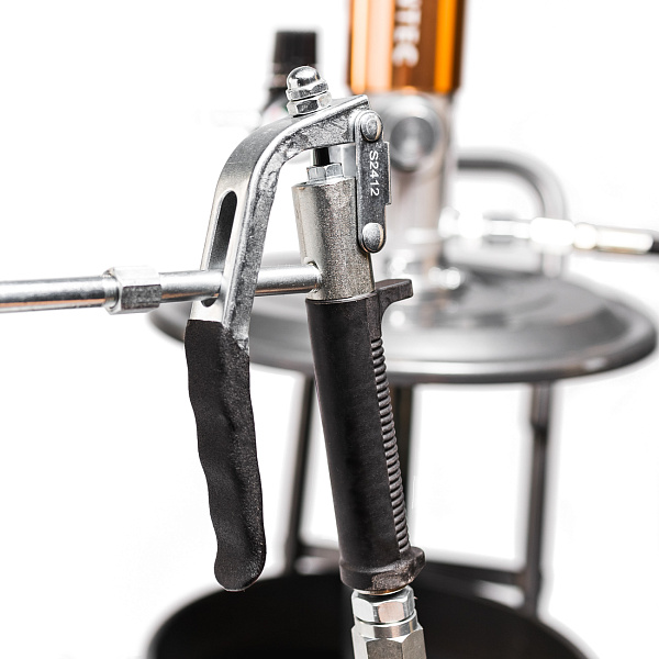 Благодаря пневмоприводу не нужно прокачивать смазку вручную. Для контроля рабочего давления насос оснащен манометром и регулятором. Рукоять и поворотные колеса помогают легко перемещать устройство.