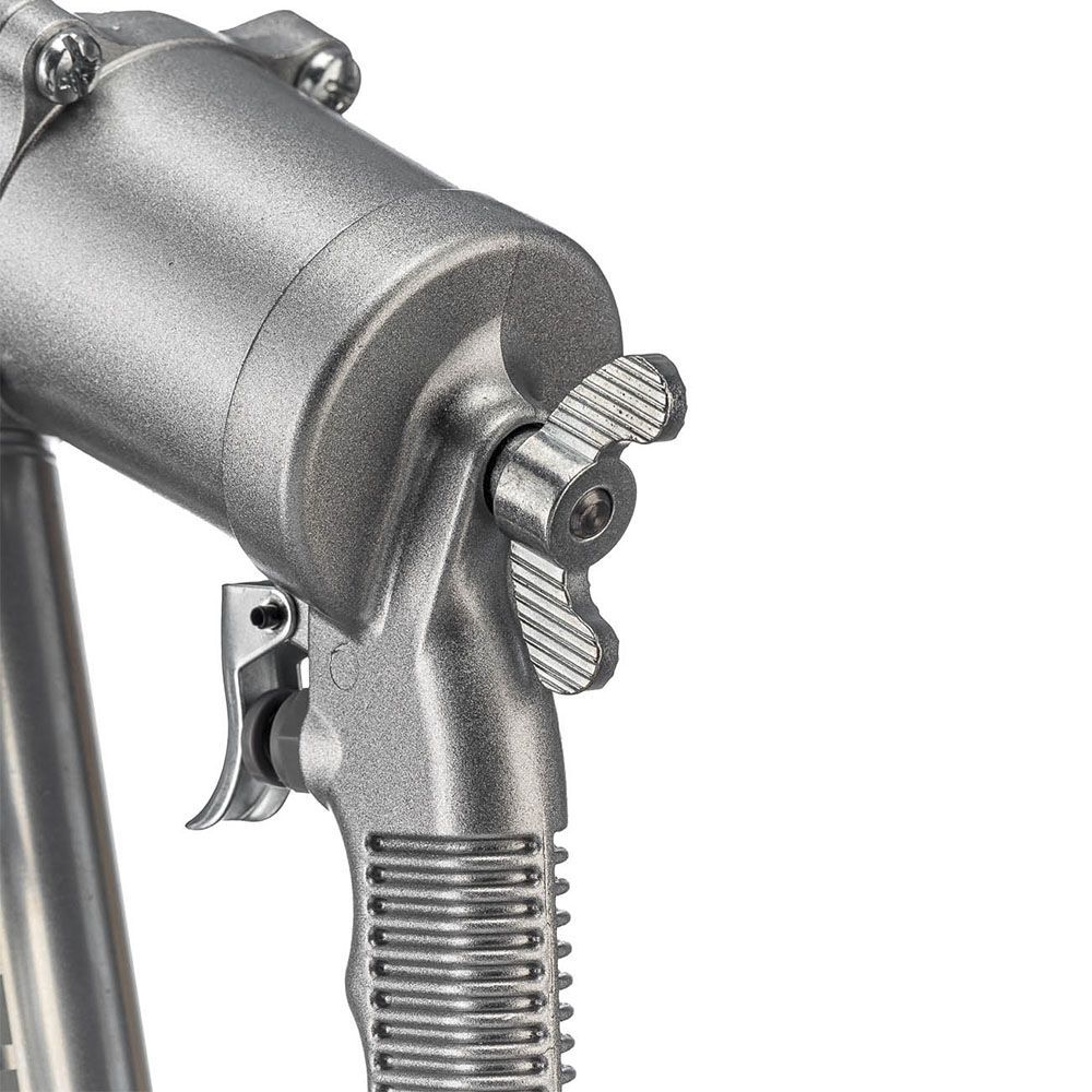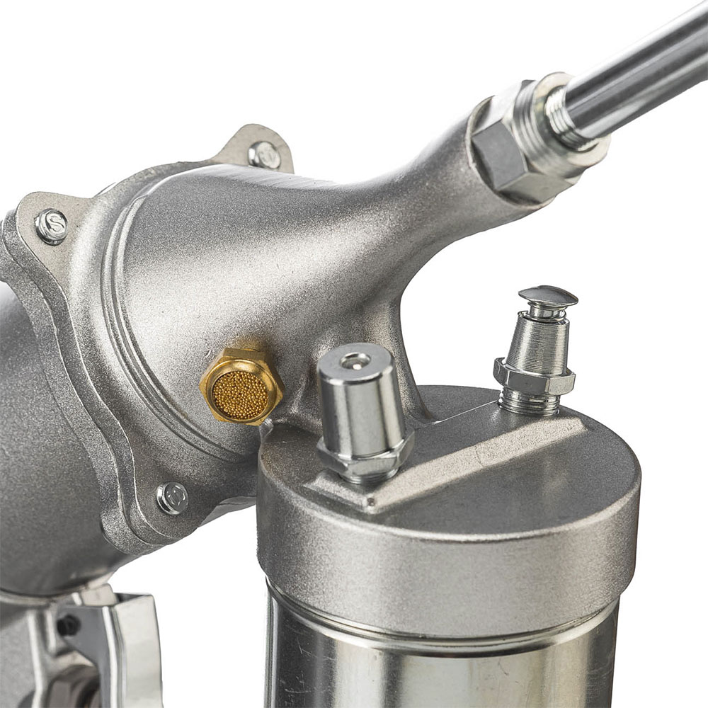Главным преимуществом данной модели является автоматическая беспрерывная подача смазочных материалов, что исключает необходимость постоянно нажимать на курок для выдавливания новой порции. Это особенно важно в случаях, когда требуется закачивать большие объемы смазочного масла. Имеет возможность заполнения ручным способом или посредством картриджа со смазкой объемом 400 мл. Эргономичная ребристая рукоятка для удобства работы. На рукоятке расположен барашек для регулировки. Небольшой вес и габариты позволяют эксплуатировать инструмент одной рукой.