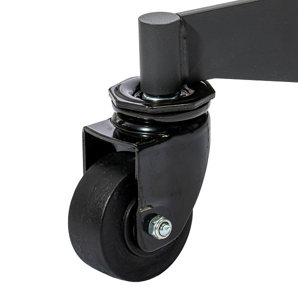Стойка оснащена нейлоновыми колесами, которые обеспечивают легкость перемещения и высокую маневренность. Благодаря высокой плотности и однородности материала такие колеса менее подвержены повреждениям даже при длительном воздействии статических и динамических нагрузок. Кроме того, они обладают высокой устойчивостью к воздействию влаги и агрессивных сред.
