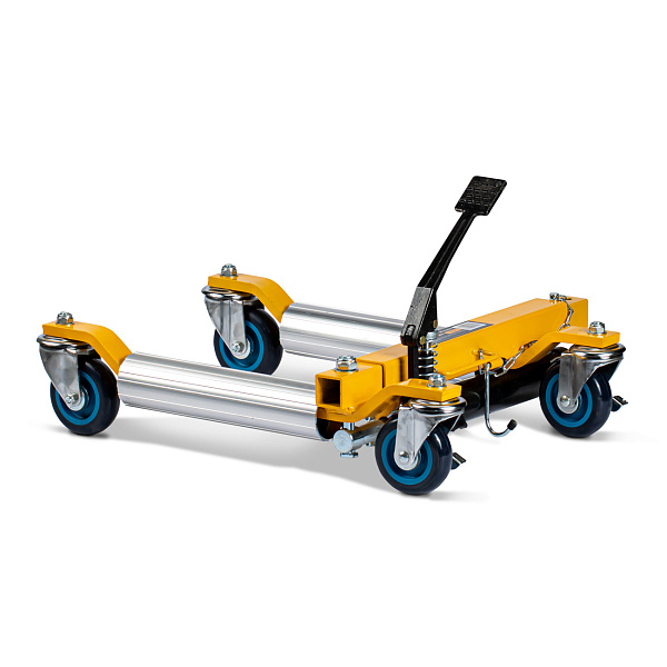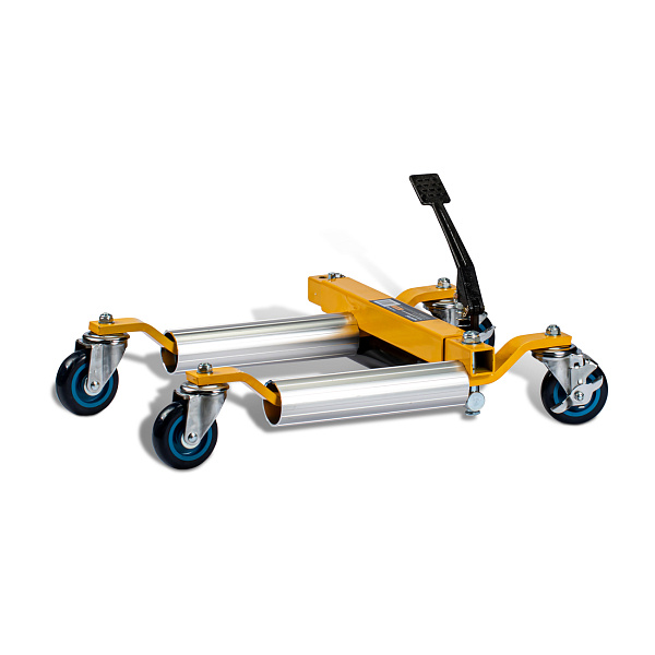 Тележка для перемещения автомобилей предназначена для эвакуации и перемещения на территории автосервиса или стоянки автомобилей с заблокированными или отсутствующими колесами, а также с заблокированными АКПП или сломанными шаровыми опорами. Для удобства подъема автомобиля на тележку, она оснащена гидравлическим механизмом. Конструкция тележки позволяет использовать ее с большинством современных автомобилей, подхват — за колесо. Гидропривод от педали позволяет изменять ширину подхвата.