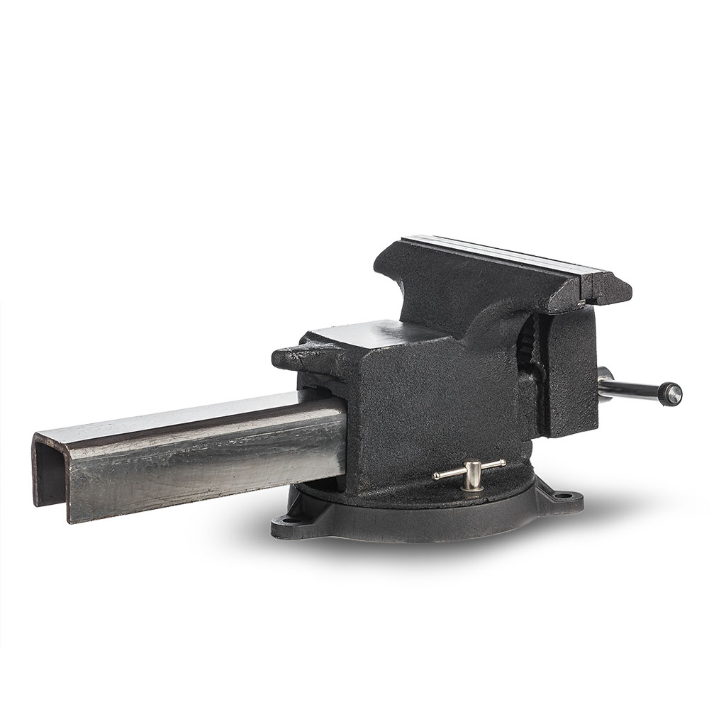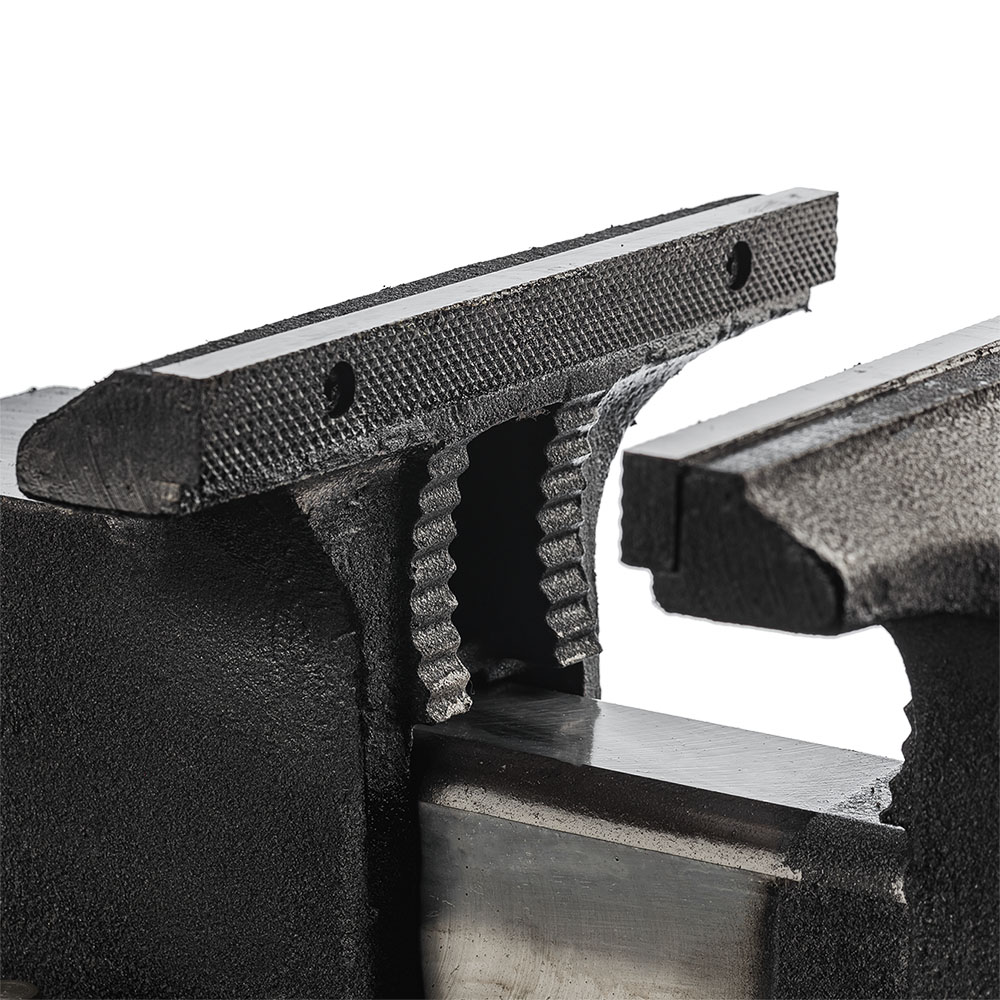 Тиски изготовлены из качественной инструментальной стали. Массивная конструкция позволяет избегать деформации инструмента. Стандартные съемные рифленые губки выполнены из закаленной стали.