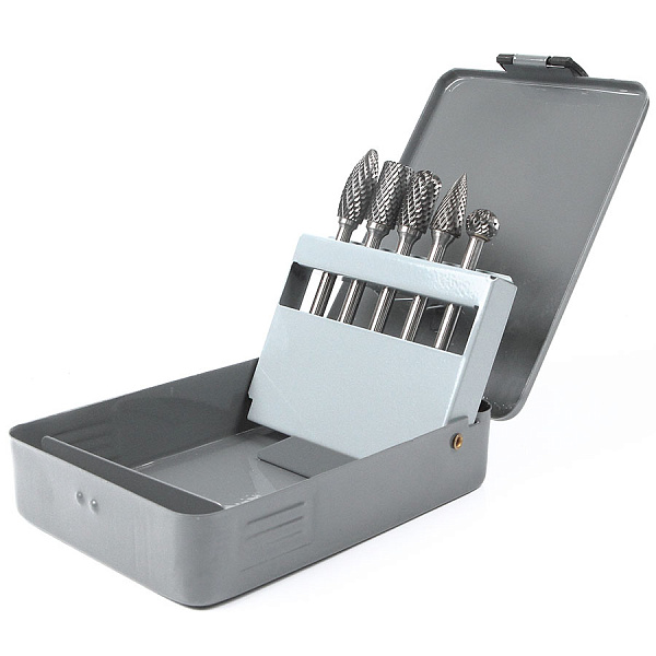 Комплект из 5 борфрез поставляется в металлическом кейсе. Диаметры хвостовиков - 6 мм.