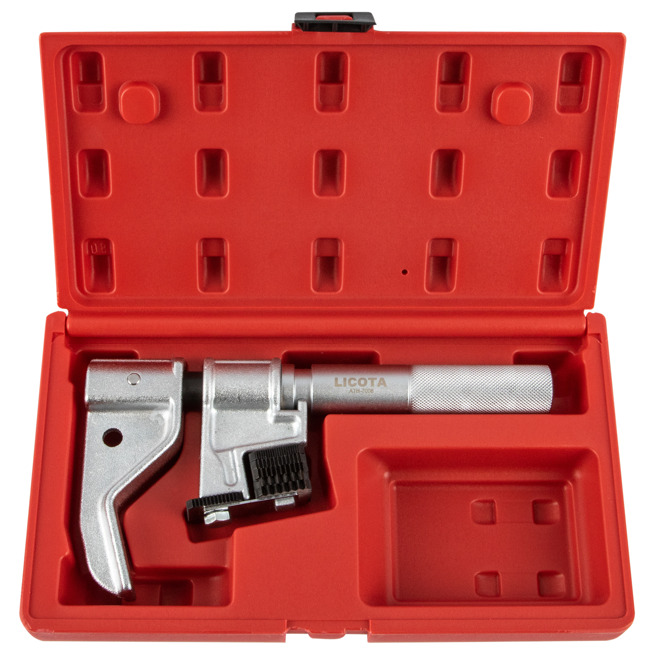 Универсальное приспособление Licota ATH-7006 подходит для очистки от загрязнений и ремонта внешних метрических и дюймовых резьб диаметром от 32 мм до 125 мм. Для наладки приспособления установите соответствующую шагу резьбы гребенку в рабочее положение, настройте приспособление на диаметр резьбы и вращением приведите резьбу в рабочее состояние.