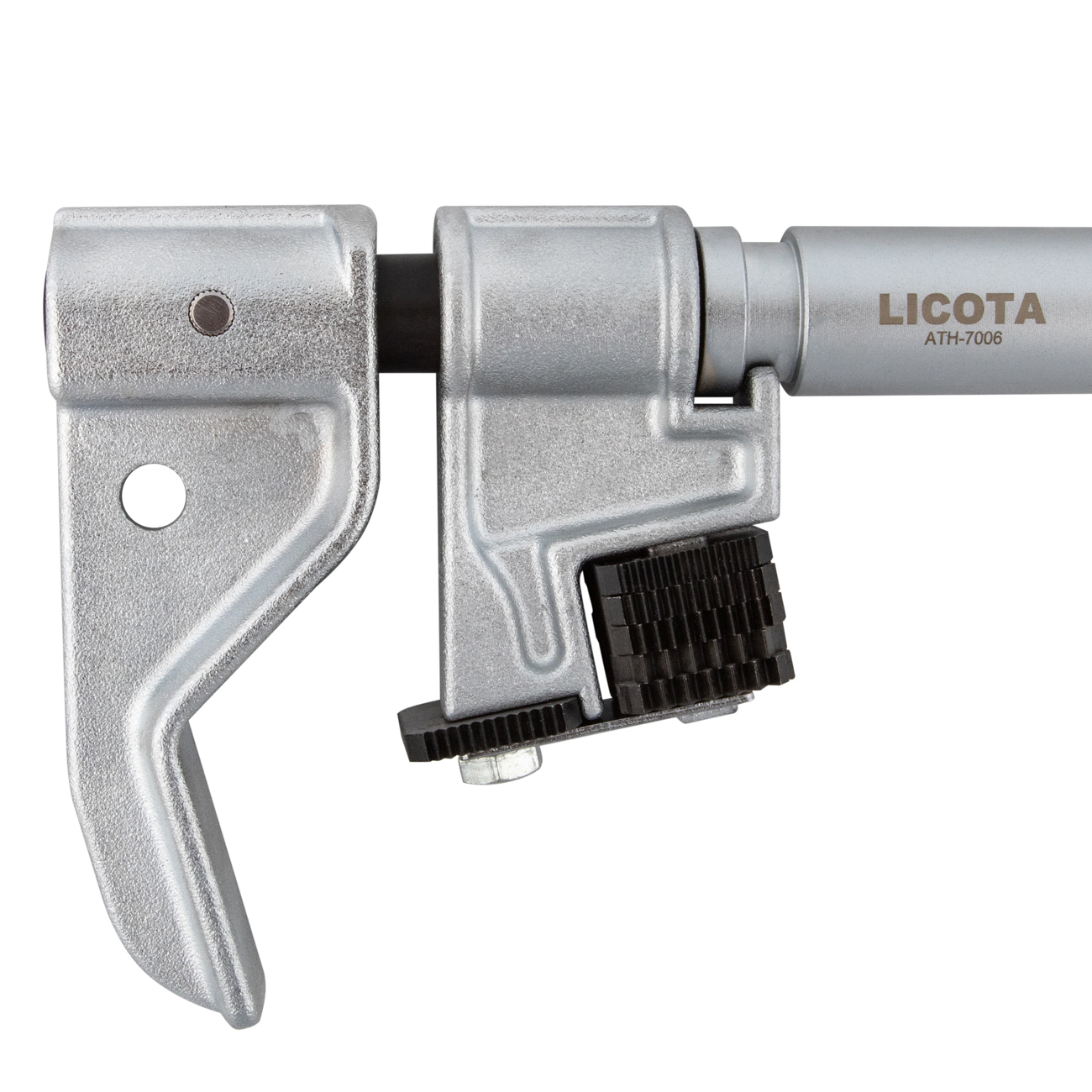 Универсальное приспособление Licota ATH-7006 подходит для очистки от загрязнений и ремонта внешних метрических и дюймовых резьб диаметром от 32 мм до 125 мм. Для наладки приспособления установите соответствующую шагу резьбы гребенку в рабочее положение, настройте приспособление на диаметр резьбы и вращением приведите резьбу в рабочее состояние.