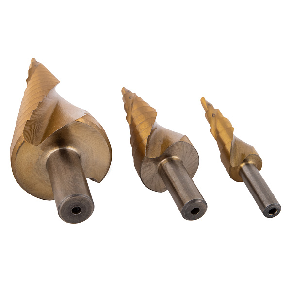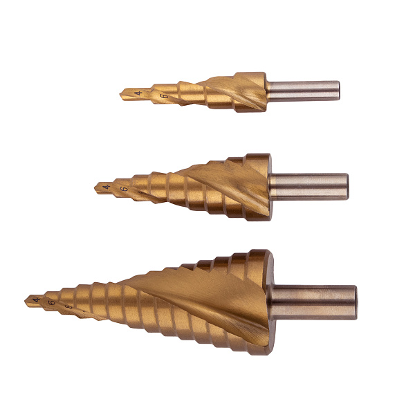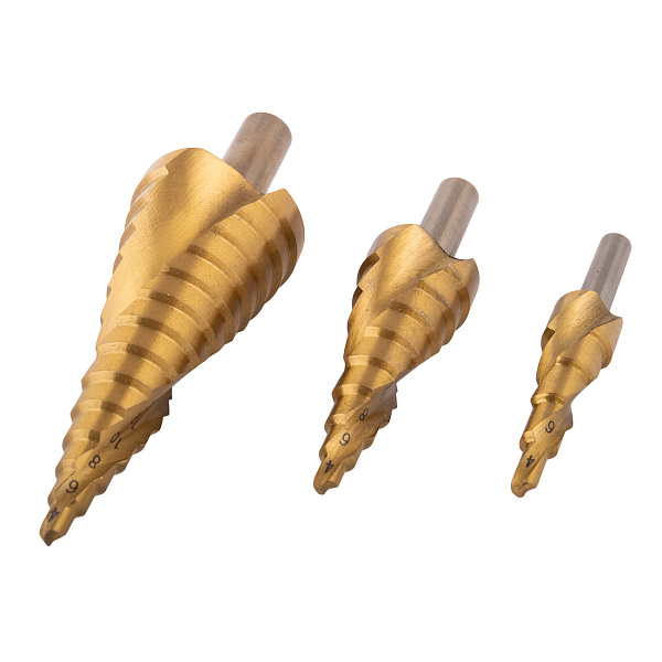 Набор ступенчатых сверл 4-12, 4-20, 4-30 мм, HSS, TiN, со спиральной канавкой