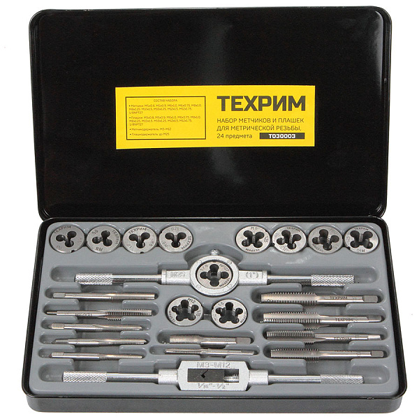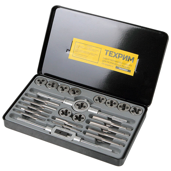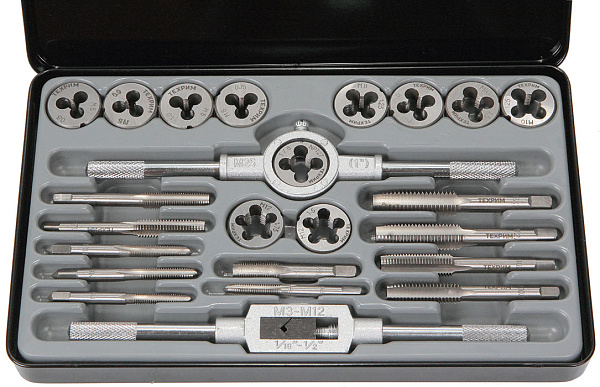 Набор плашек и метчиков T030003 - используется для нарезания как внешней, так и внутренней резьбы на металлических деталях, имеющих цилиндрическую форму. Позволяет работать с цветными металлами и сталью.