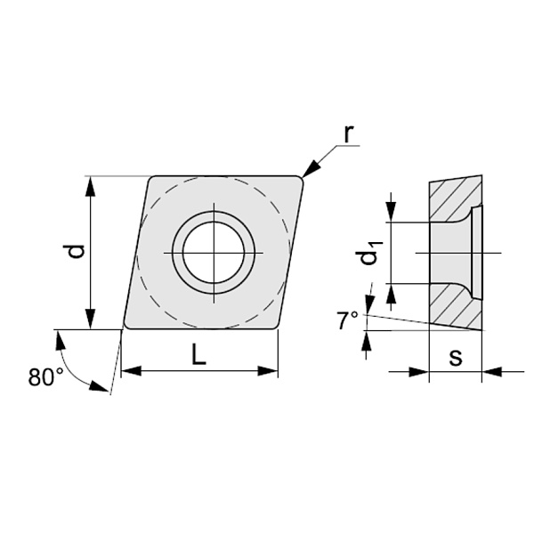 Пластина сменная токарная ромбической формы с углом 80 градусов, отверстием и стружколомающими канавками на одной стороне.