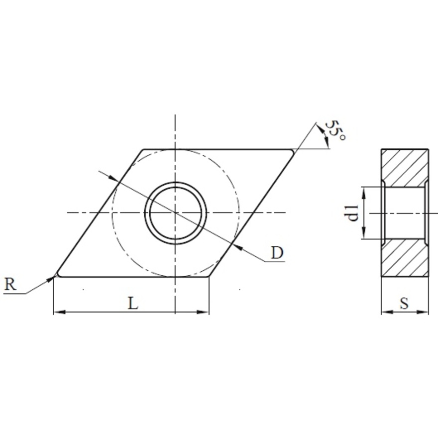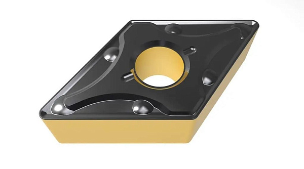 Пластина сменная токарная ромбической формы с углом 55 градусов, тороидальным отверстием и стружколомающими канавками на одной стороне.