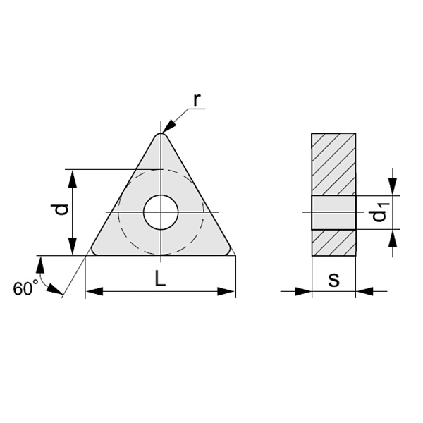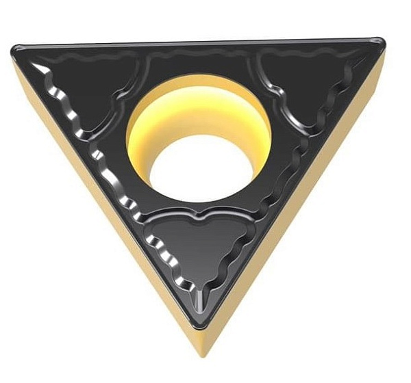 Пластина сменная токарная треугольной формы с углом 60 градусов, тороидальным отверстием и стружколомающими канавками на одной стороне.