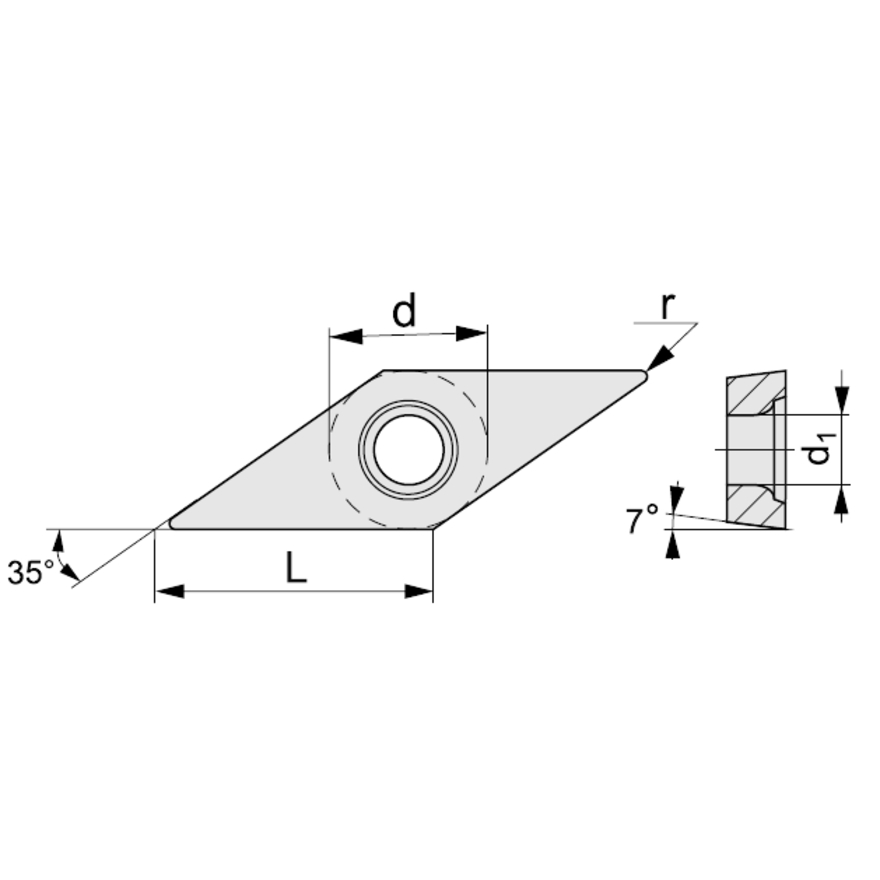 Пластина сменная токарная ромбической формы с углом 35 градусов, тороидальным отверстием и стружколомающими канавками на одной стороне.