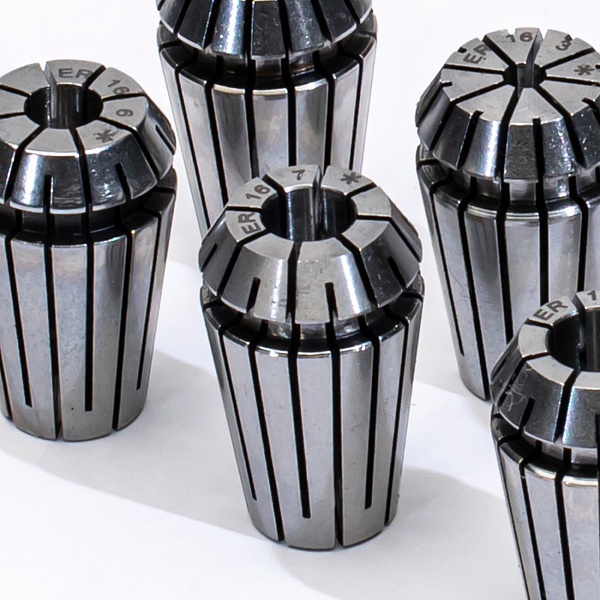 Комплект цанг типа ER зажимаются в соответствующих фрезерных патронах, как с хвостовиком Морзе, так и конусах SK, BT, NT, HSK, а также в оправках с цилиндрическим хвостовиком. Цанга затягивается определенной гайкой (A тип, UM, мини гайка) подходящим ключом. В комплекте 10 цанг ER16 разных диаметров.