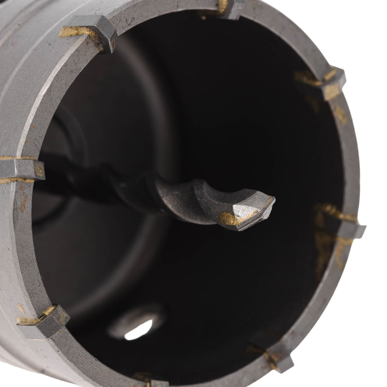 Не подходит для использования с армированным бетоном. Поставляется в сборе с хвостовиком и направляющим сверлом, поэтому сразу готова к работе. После засверливания рекомендуется снимать направляющее сверло.