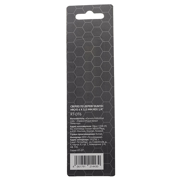 Сверло по дереву Runtec HRC45 6 x 115 мм HEX 1/4", RT-DT6