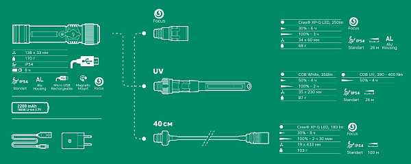 Фонарь оснащен двумя типами светодиодов и тремя сменными насадками под разный функционал: