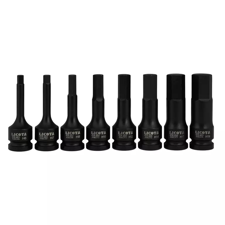 Набор ударных шестигранников Licota ASA-40001 из хром-молибденовой стали, 8 внешних шестигранников размерами от 6 до 19 мм. Комплект предназначен для монтажа резьбового крепежа. Чаще всего используются при работе с ударным гайковертом. Размер привода — ½ дюйма (12,7 мм).