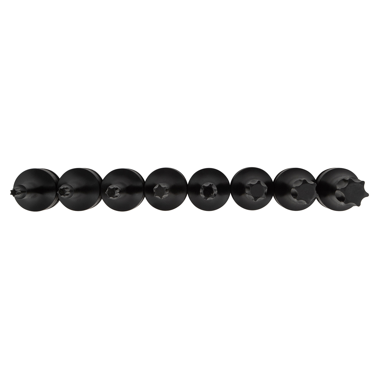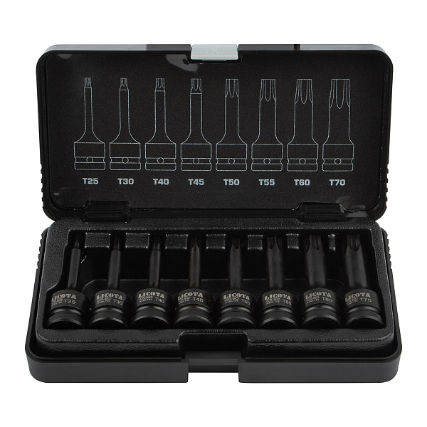 Набор ударных головок Licota ASA-40007 состоит из 8 удлиненных головок с рабочим профилем Torx размером от Т25 до Т70. Материал головок - хром-молибденовая сталь.
