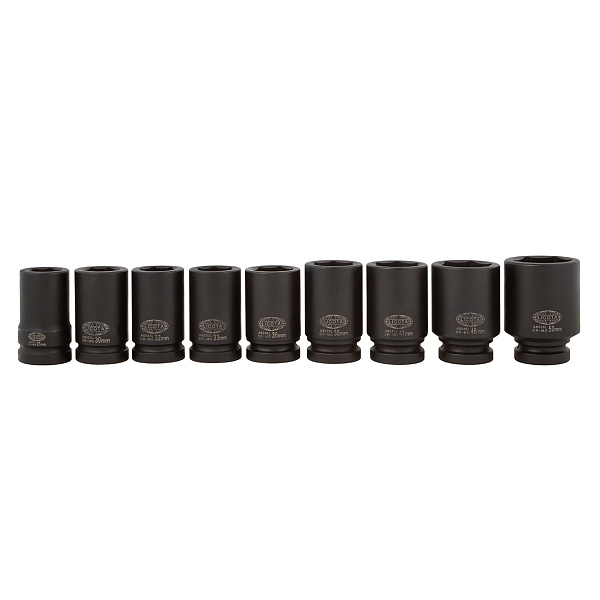 В наборе 9 удлиненных шестигранных головок размерами от 27 до 50 мм.